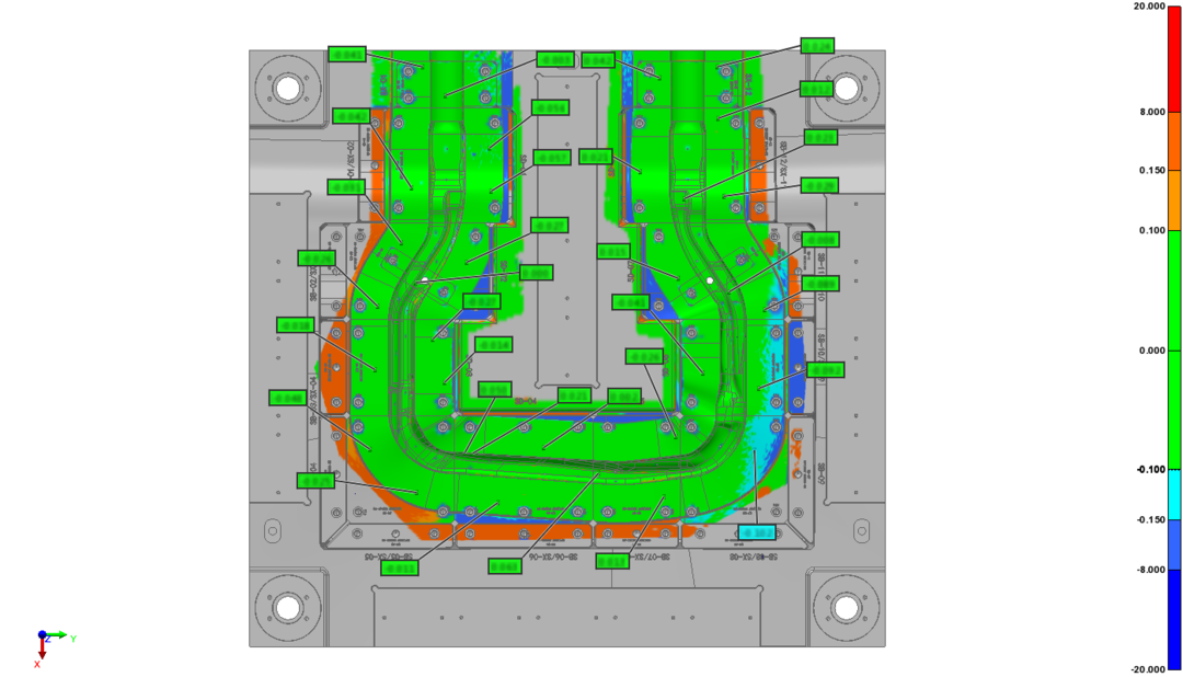 將掃描得到的三維數據與原數模進行比對分析,獲取偏差尺寸,為質量檢測及修模改模提供精確且直觀的數據報告,大大提升模具生產效率和產品質量。